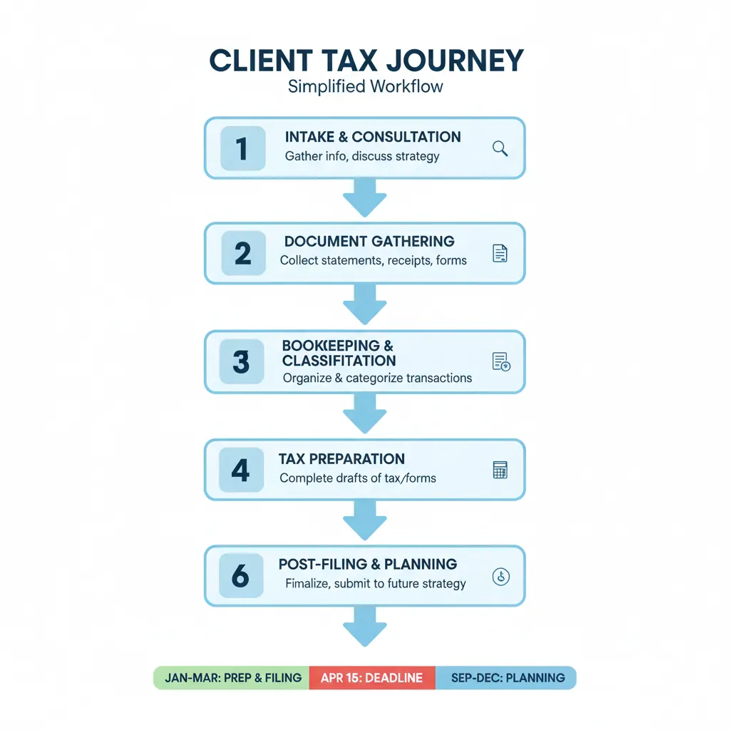 File Accurately & On Time → Gather financials, prepare business tax returns, and submit federal/state filings.